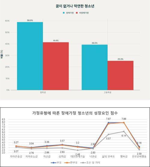 Á¶»ç°á°ú, û¼Ò³âÀÇ Áø·ÎÁغñ¿¡ Áß¿äÇÑ ¿ä¼Ò Áß ÇϳªÀÎ ‘Àå·¡Èñ¸Á(²Þ)’¿¡ ´ëÇØ Àå¾Ö°¡Á¤ û¼Ò³â Áß ÁßÇлýÀÇ 58.9%, °íµîÇлýÀÇ 39.3%´Â ‘Àå·¡ Èñ¸ÁÀ̳ª ²ÞÀÌ ¾ø°Å³ª ¸·¿¬ÇÏ´Ù’°í ÀÀ´äÇÑ °ÍÀ¸·Î Á¶»çµÇ¾ú´Ù. 2022³â ¿ùµåºñÁ¯¿¡¼ Á¶»çÇÑ ÁßÇлý 41.4%, °íµîÇлý 25.3%ÀÎ Á¶»ç°á°ú¿Í ºñ±³ÇÒ ¶§ Àå¾Ö°¡Á¤ û¼Ò³âÀº Àå·¡Èñ¸Á(²Þ)ÀÌ ¾ø´Â ºñÀ²ÀÌ »ó´ëÀûÀ¸·Î ³ôÀº °ÍÀ¸·Î ºÐ¼®µÆ´Ù.