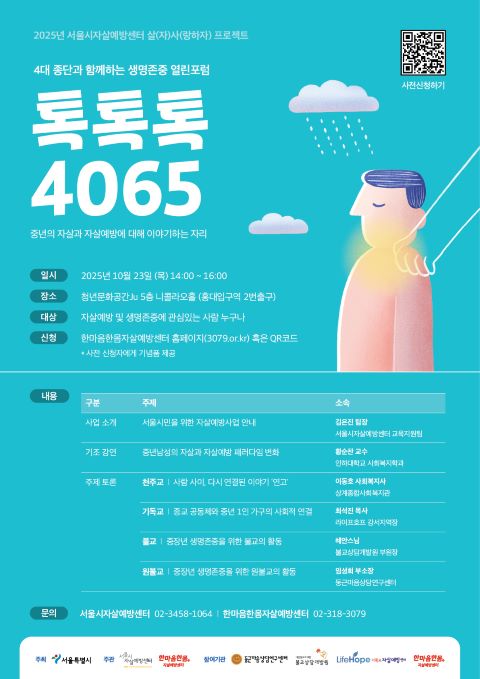 2025³â »ì»çÇÁ·ÎÁ§Æ® ¿¸°Æ÷·³ ‘ÅåÅåÅå 4065’´Â Àڻ쿹¹æ¿¡ °ü½ÉÀÖ´Â ½Ã¹Î ´©±¸³ª Âü¼® °¡´ÉÇϸç, 10¿ù 22ÀÏ(¼ö)±îÁö ±¸±ÛÆû(https://buly.kr/ESzFZKl)À» ÅëÇØ ½Åû¹Þ°í ÀÖ´Ù. ÀÚ¼¼ÇÑ ³»¿ëÀº ¼¿ï½ÃÀڻ쿹¹æ¼¾ÅÍ ±³À°Áö¿øÆÀ ¶Ç´Â ÇѸ¶À½ÇѸö¿îµ¿º»ºÎ Àڻ쿹¹æ¼¾ÅÍ·Î ¹®ÀÇÇÏ¸é µÈ´Ù.