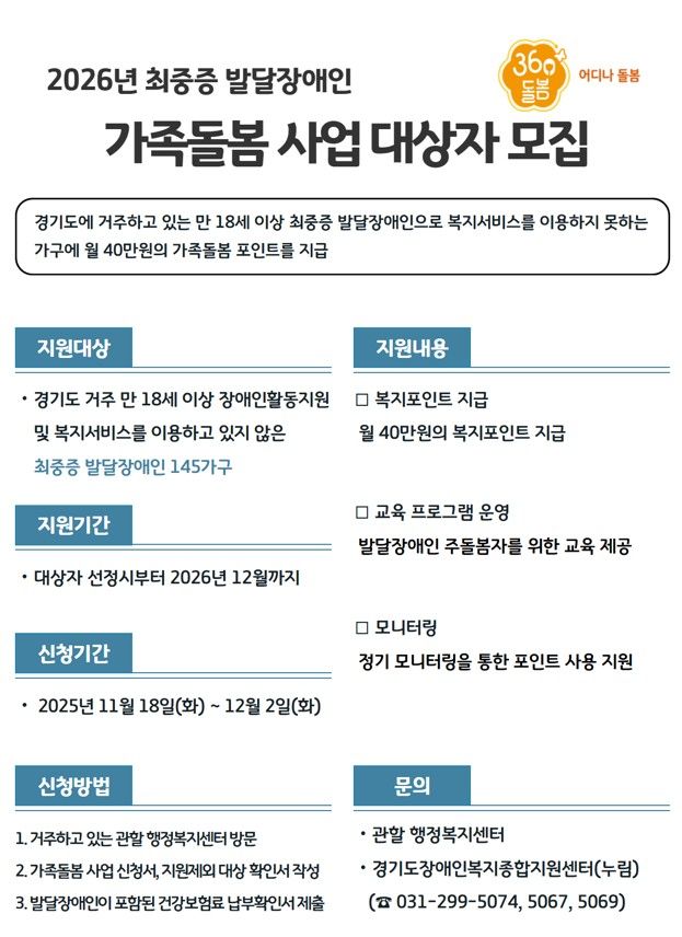 Áö¿ø ´ë»óÀº °æ±âµµ¿¡¼ °ÅÁÖÇÏ´Â º¹Áö°ü, Á÷¾÷ÀçȰ¼ºñ½º µî º¹Áö¼ºñ½º ¹ÌÀÌ¿ëÀ¸·Î µ¹º½»ç°¢Áö´ë¿¡ ³õÀÎ ¸¸ 18¼¼ ÀÌ»ó ¹ß´ÞÀå¾ÖÀÎÀÌ´Ù. ¼±Á¤ ½Ã ¿ù 40¸¸¿ø °¡Á·µ¹º½Æ÷ÀÎÆ®¸¦ 1³â°£ Áö¿øÇϰí Áö¼ÓÀûÀÎ ¸ð´ÏÅ͸µÀ¸·Î º¹Áö¼ºñ½º¿Í ´ë»óÀÚ¸¦ ¿¬°èÇÏ´Â ¼ºñ½º¸¦ Á¦°øÇÑ´Ù.