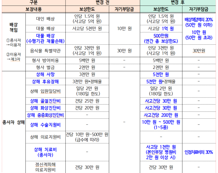 º¹ÁöºÎ´Â 1³â°£ ÃàÀûµÈ µ¥ÀÌÅÍ¿Í ÇöÀå ÀǰßÀ» ¹ÙÅÁÀ¸·Î ÀںδãÀº ³·Ãß°í ¼Ò¾×Ä¡·á º¸ÀåÀº È®´ëÇÏ´Â µî Á¦µµ¸¦ °³¼±Çß´Ù. À̹ø º¸À强 °È ½ÃÇàÀ¸·Î »óÇØ Ä¡·áºñ¿Í ¼ÕÇØ±â°ü Àç¹°¼ÕÇØ¹è»óÀÌ ½Å¼³µÇ°í, ´ë¹°¹è»ó º¸»óÇѵµ´Â »ç°í´ç 5000¸¸¿ø¿¡¼ 1¾ï¿øÀ¸·Î, »óÇØ »ç¸Á º¸»óÇѵµ´Â 3000¸¸¿ø¿¡¼ 5000¸¸¿øÀ¸·Î »óÇâµÆ´Ù.