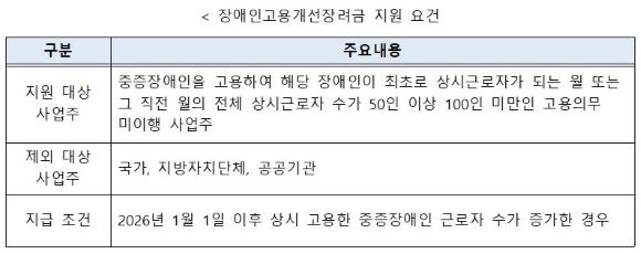 Çѱ¹Àå¾ÖÀΰí¿ë°ø´Ü(ÀÌ»çÀå ÀÌÁ¾¼º)Àº ±â¾÷ÀÇ Á¡ÁøÀûÀÎ Àå¾ÖÀÎ °í¿ëÀǹ« ÀÌÇàÀ» À¯µµÇϰí, ÁßÁõÀå¾ÖÀÎ ÀÏÀÚ¸® âÃâÀ» À§ÇØ ‘Àå¾ÖÀΰí¿ë°³¼±Àå·Á±Ý’À» 2026³â 1¿ù 1ÀϺÎÅÍ Áö¿øÇÑ´Ù°í ¹àÇû´Ù.