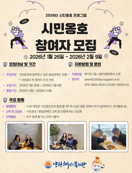 ½Ã¹Î¿ËÈ£ÀÎ Âü¿©¸¦ Èñ¸ÁÇÏ´Â Áö¿ªÁÖ¹ÎÀº ¾çÃµÇØ´©¸®º¹Áö°ü ȨÆäÀÌÁö(https://ycsupport.or.kr/)¸¦ ÅëÇØ ½Åû¼¸¦ ÀÛ¼ºÇÑ ÈÄ À̸ÞÀÏ ¶Ç´Â ³×À̹ö ÆûÀ¸·Î Á¢¼öÇÏ¸é µÈ´Ù. ¹ß´ÞÀå¾ÖÀÎ Âü¿©ÀÚ´Â ¾çÃµÇØ´©¸®º¹Áö°ü 2Ãþ »ç¶÷ÀÌÀ½ÆÀÀ» ¹æ¹®ÇØ ½ÅûÇÒ ¼ö ÀÖ´Ù.