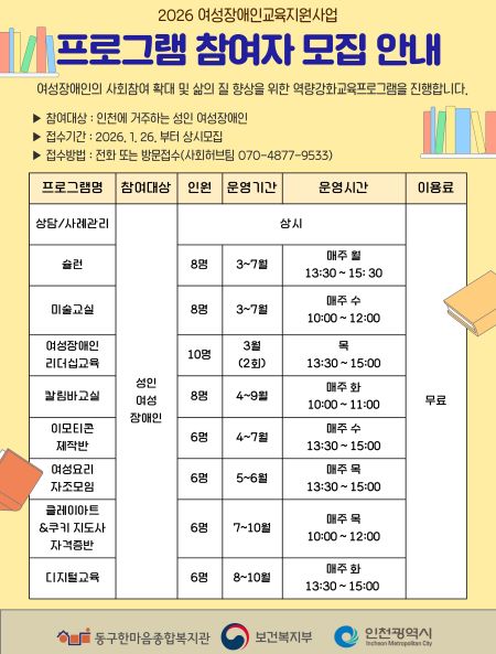 µ¿±¸ÇѸ¶À½Á¾ÇÕº¹Áö°ü¿¡¼ ¿î¿µÇÏ´Â ¿©¼ºÀå¾ÖÀα³À°Áö¿ø»ç¾÷Àº ÀÎõ¿¡ °ÅÁÖÇÏ´Â ¼ºÀÎ ¿©¼ºÀå¾ÖÀÎÀ̶ó¸é ´©±¸³ª ¹«·á·Î Âü¿©ÇÒ ¼ö ÀÖ´Ù. ÀÚ¼¼ÇÑ »çÇ×Àº µ¿±¸ÇѸ¶À½Á¾ÇÕº¹Áö°ü »çȸÇãºêÆÀÀ¸·Î ¹®ÀÇÇÏ¸é µÈ´Ù.