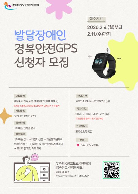 | °æ»óºÏµµÀå¾Ö¾Æµ¿·¹ß´ÞÀå¾ÖÀÎÁö¿ø¼¾ÅÍ´Â _°æºÏGPS_ º¸±Þ»ç¾÷ ´ë»óÀÚ¸¦ 2¿ù 9ÀϺÎÅÍ 11ÀϱîÁö ¼±Âø¼øÀ¸·Î ¸ðÁýÇÑ´Ù. |