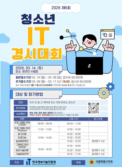 Çѱ¹Á¤º¸±â¼úÁøÈï¿ø(ÀÌÇÏ ÁøÈï¿ø)ÀÌ ¿À´Â 3¿ù 14ÀÏ(Åä) ‘2026 Á¦6ȸ û¼Ò³â IT°æ½Ã´ëȸ’¸¦ °³ÃÖÇÑ´Ù.