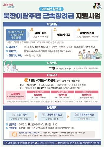 ½Åû ´ë»óÀº Áֹεî·Ï ÁÖ¼ÒÁö°¡ ¼¿ïÀÎ ¸¸ 18¼¼ ÀÌ»ó ºÏÇÑÀÌÅ»ÁÖ¹ÎÀ̸ç, ¼ÒµæÀº ¿ÃÇØ ±âÁØÁßÀ§¼Òµæ ±âÁØ 150% ÀÌÇÏ¿©¾ß ÇÑ´Ù. ±Ù¼Ó 1³â ÀÌ»óÀº ¿ù 10¸¸¿ø, ±Ù¼Ó 3³â ÀÌ»óÀº ¿ù 15¸¸¿ø, ±Ù¼Ó 5³â ÀÌ»óÀº ¿ù 20¸¸¿ø¾¿ ÃÖ´ë 2³â µ¿¾È Áö±ÞÇÑ´Ù.