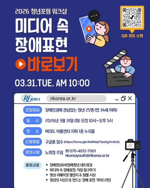 Çѱ¹Àå¾ÖÀÎÀçȰÇùȸ(ȸÀå ³ª¿îȯ, ÀÌÇÏ ‘RI Korea’À̶ó ÇÔ)´Â ¿À´Â 31ÀÏ ¿ÀÀü 10½Ã, ¿©Àǵµ ÀÌ·ë¼¾ÅÍ¿¡¼ ⌜2026 û³âÆ÷·³ ¿öÅ©¼¥⌟(ºÎÁ¦: ¹Ìµð¾î ¼Ó Àå¾ÖÇ¥Çö ¹Ù·Îº¸±â)À» °³ÃÖÇÑ´Ù.