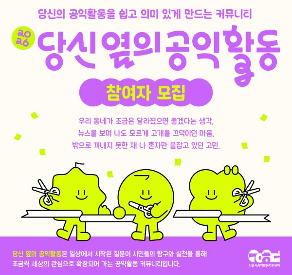 ¼¿ï½Ã°øÀÍȰµ¿Áö¿ø¼¾ÅͰ¡ °øÀÍȰµ¿ ½Ã¹Î¸ðÀÓ Áö¿ø»ç¾÷ ‘´ç½Å ¿·ÀÇ °øÀÍȰµ¿’ÀÇ 2026³â »ó¹Ý±â Âü¿©ÀÚ¸¦ ¸ðÁýÇÑ´Ù.