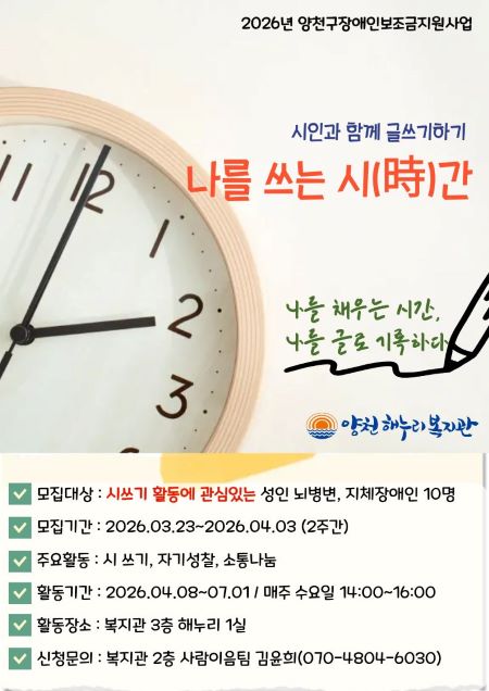 ¾çÃµÇØ´©¸®º¹Áö°ü(°üÀå ±è°æÈ¯)Àº ¾çõ±¸¿¡ °ÅÁÖÇÏ´Â Àå¾ÖÀÎÀ» ´ë»óÀ¸·Î ÀÚ½ÅÀÇ »îÀ» µ¹¾Æº¸°í ±Û·Î Ç¥ÇöÇÏ´Â ½Ã ¾²±â Ȱµ¿ ‘³ª¸¦ ¾²´Â ½Ã°£’ Âü¿©ÀÚ¸¦ ¿À´Â 23ÀϺÎÅÍ ³»´Þ 3ÀϱîÁö ¸ðÁýÇÑ´Ù.