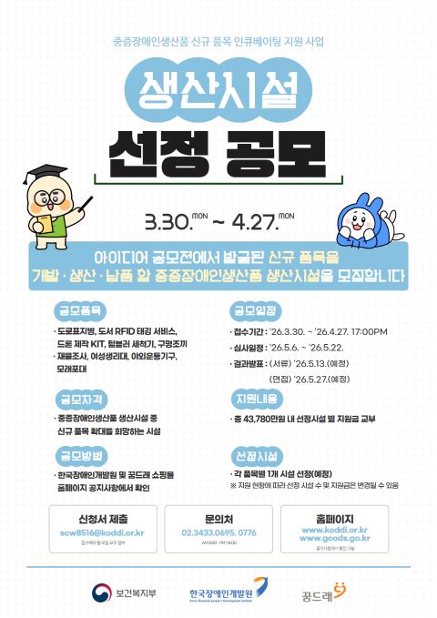Çѱ¹Àå¾ÖÀΰ³¹ß¿ø(¿øÀå À̰æÇý, ÀÌÇÏ °³¹ß¿ø)Àº ÁßÁõÀå¾ÖÀλý»êǰÀÇ Ç°¸ñ ´Ù¾çȸ¦ ÅëÇÑ °ø°ø±â°ü ¿ì¼±±¸¸Å ½ÃÀå È®´ë¸¦ À§ÇØ ¿À´Â 4¿ù 27ÀϱîÁö ‘2026³â ÁßÁõÀå¾ÖÀλý»êǰ ½Å±Ô ǰ¸ñ ÀÎÅ¥º£ÀÌÆÃ Áö¿ø»ç¾÷ »ý»ê½Ã¼³ °ø¸ð’¸¦ ½Ç½ÃÇÑ´Ù°í 31ÀÏ ¹àÇû´Ù.