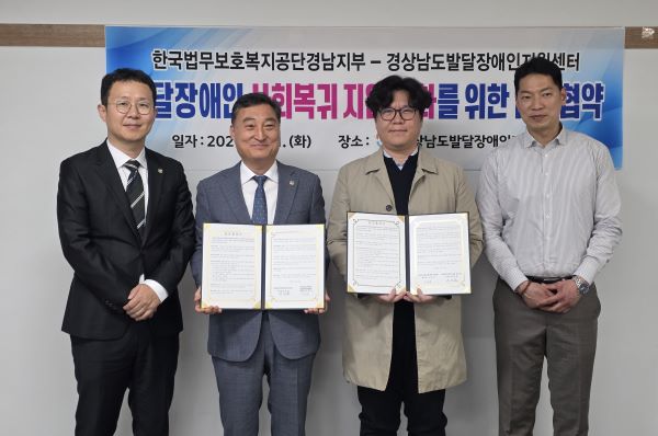 Çѱ¹Àå¾ÖÀΰ³¹ß¿ø °æ»ó³²µµÀå¾Ö¾Æµ¿¤ý¹ß´ÞÀå¾ÖÀÎÁö¿ø¼¾ÅÍ(¼¾ÅÍÀå À̵¿¿í, ÀÌÇÏ °æ³²¼¾ÅÍ)´Â Çѱ¹¹ý¹«º¸È£º¹Áö°ø´Ü °æ³²ÁöºÎ(ÁöºÎÀå ÃÖ¿ë½Ä)¿Í Áö³ 31ÀÏ °æ³²¼¾ÅÍ È¸Àǽǿ¡¼ ¹ß´ÞÀå¾ÖÀÎ Ãâ¼ÒÀÚÀÇ ¾ÈÁ¤ÀûÀÎ Áö¿ª»çȸ º¹±Í¿Í ÀÚ¸³ Áö¿øÀ» À§ÇÑ ¾÷¹«Çù¾àÀ» ü°áÇß´Ù.