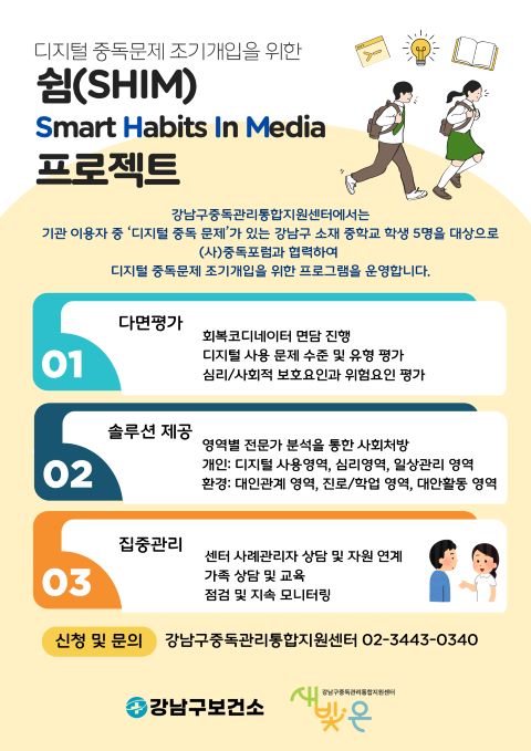°³²±¸Áßµ¶°ü¸®ÅëÇÕÁö¿ø¼¾ÅÍ´Â µðÁöÅй̵ð¾î °ú»ç¿ë°ú Áßµ¶¹®Á¦¸¦ °Þ´Â û¼Ò³âÀÇ Á¶±â °³ÀÔ°ú ȸº¹ Áö¿øÀ» À§ÇØ ‘½°(SHIM, Smart Habits In Media) ÇÁ·ÎÁ§Æ®’¸¦ ¿î¿µÇÑ´Ù°í ¹àÇû´Ù.