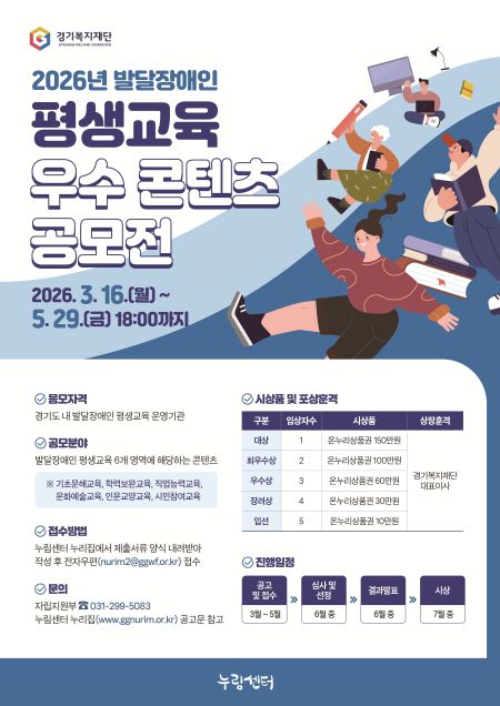 °æ±âµµÀå¾ÖÀκ¹ÁöÁ¾ÇÕÁö¿ø¼¾ÅÍ(ÀÌÇÏ ´©¸²¼¾ÅÍ)´Â ¹ß´ÞÀå¾ÖÀÎ Æò»ý±³À° ºÐ¾ßÀÇ ¿ì¼ö ±³À° ÄÜÅÙÃ÷¸¦ ¹ß±¼Çϰí, À̸¦ µµ³» ¿î¿µ ±â°ü¿¡ È®»êÇϱâ À§ÇÑ ‘2026³â ¹ß´ÞÀå¾ÖÀÎ Æò»ý±³À° ¿ì¼ö ÄÜÅÙÃ÷ °ø¸ðÀü’À» ÁøÇàÇÑ´Ù.