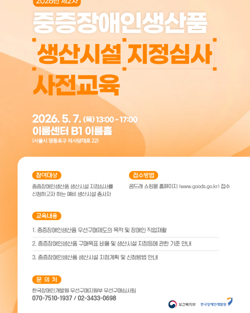 Çѱ¹Àå¾ÖÀΰ³¹ß¿ø(¿øÀå À̰æÇý, ÀÌÇÏ °³¹ß¿ø)ÀÌ ¿À´Â 5¿ù 7ÀÏ ¼¿ï ¿©Àǵµ ÀÌ·ë¼¾ÅÍ ÀÌ·ëȦ¿¡¼ ÁßÁõÀå¾ÖÀλý»êǰ »ý»ê½Ã¼³ Á¾»çÀÚ¸¦ ´ë»óÀ¸·Î ‘2026³â Á¦2Â÷ ÁßÁõÀå¾ÖÀλý»êǰ »ý»ê½Ã¼³ ÁöÁ¤½É»ç »çÀü±³À°’À» ½Ç½ÃÇÑ´Ù.