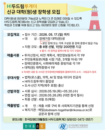 Çѱ¹Àå¾ÖÀÎÀçȰÇùȸ(ȸÀå ³ª¿îȯ)¿Í Çö´ëȨ¼îÇÎ(´ëÇ¥ÀÌ»ç Çѱ¤¿µ)Àº Àú¼Òµæ Àå¾Ö°¡Á¤ û³âµéÀÇ ±³À° ±âȸ È®´ë¿Í ¹Ì·¡ ¿ª·® °È¸¦ À§ÇØ ‘H!µÎµå¸²Åõ°Ô´õ ´ëÇÐ(¿ø)»ý ÀåÇлý’À» ¸ðÁýÇÑ´Ù.
