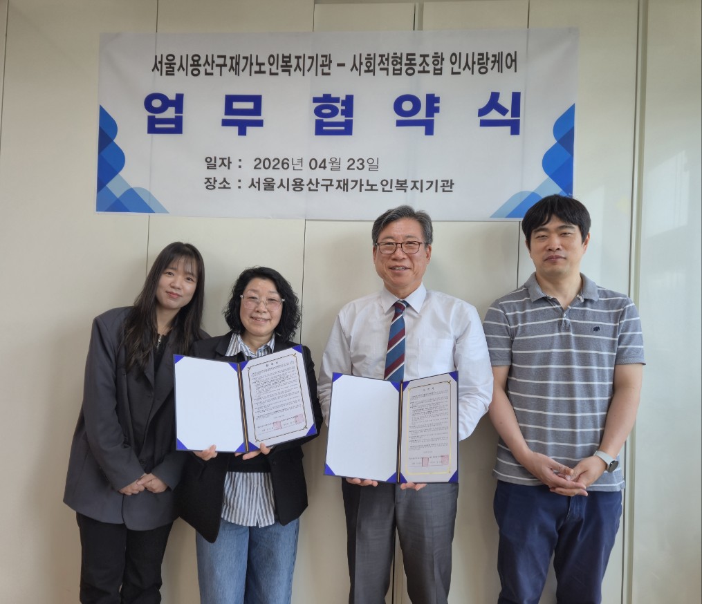 ¼¿ï½Ã¿ë»ê±¸Àç°¡³ëÀκ¹Áö±â°ü°ú »çȸÀûÇùµ¿Á¶ÇÕ Àλç¶ûÄɾî´Â Áö³ 4¿ù 23ÀÏ ¾÷¹«Çù¾à½ÄÀ» °®°í, ¿ë»ê±¸ ³» Åð¿ø ¾î¸£½Å°ú Àç°¡ ¾î¸£½ÅÀ» À§ÇÑ µ¹º½¼ºñ½º ¿¬°è·Çù·Â ü°è¸¦ ±¸ÃàÇϱâ·Î Çß´Ù.
