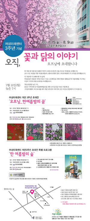 Çѱ¹¿©¼º´Üü¿¬ÇÕÀº 15ÀϺÎÅÍ 8¿ù 9ÀϱîÁö ¿©¼º¹Ì·¡¼¾ÅÍ Ç㽺Å丮Ȧ¿¡¼ °³°ü 3Áֳ⠱â³ä ÃÊ´ëÀü ¡®¿ÀÁ÷, ²É°ú ´ßÀÇ À̾߱⡯¸¦ ½Ç½ÃÇÑ´Ù.